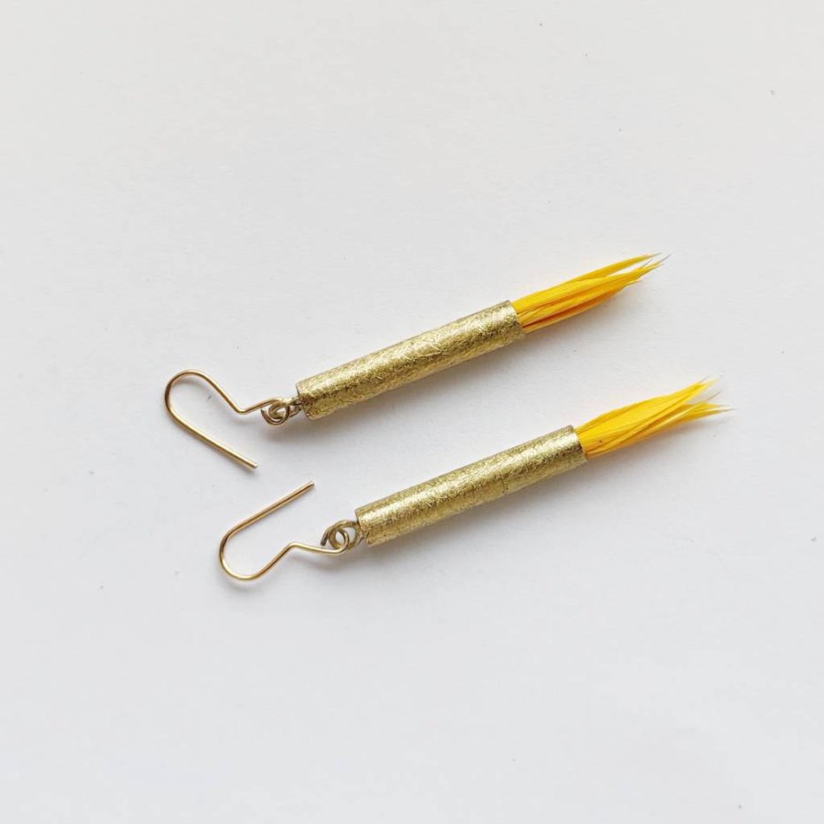 PIÓRKO - stylowy dodatek. Delikatne oraz lekkie kolczyki dodadzą charakteru każdej stylizacji. Metal niezwykle kontrastuje z naturalnym barwionym puchem. Kolczyki wykonane są z miedzi, naturalnie barwione pióra. Miedź - zmatowiony. Bigle otwarte - srebro pr.925. Długość z biglami - 5,5 cm. Szerokość - 1,5 cm. Waga - ok. 2,5 g.