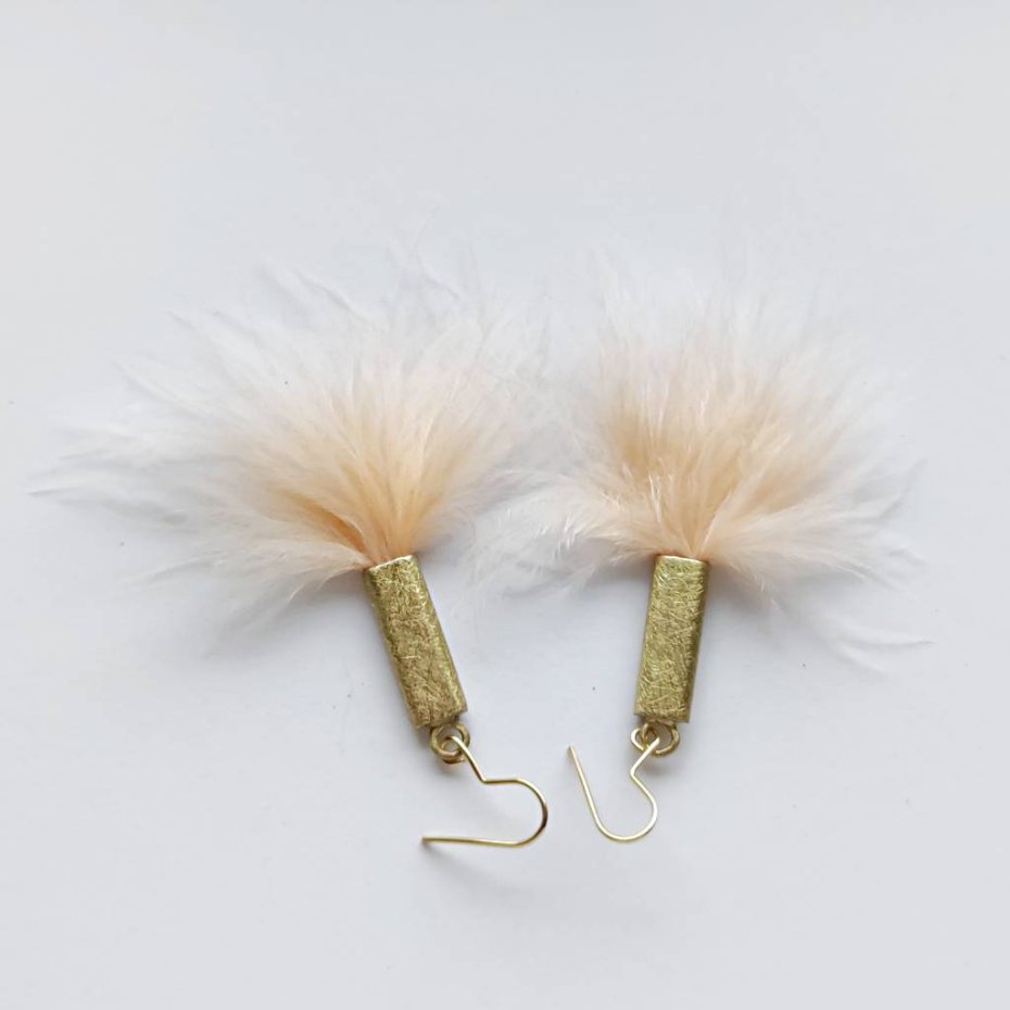 PIÓRKO - stylowy dodatek. Połączenie lekkości piórka i trwałości metalu. Metal niezwykle kontrastuje z naturalnym barwionym puchem. Kolczyki wykonane są z mosiądz, naturalnie barwione pióra. Mosiądz - zmatowiony. Bigle otwarte - srebro pr.925, pozłacane. Długość z biglami - 7 cm