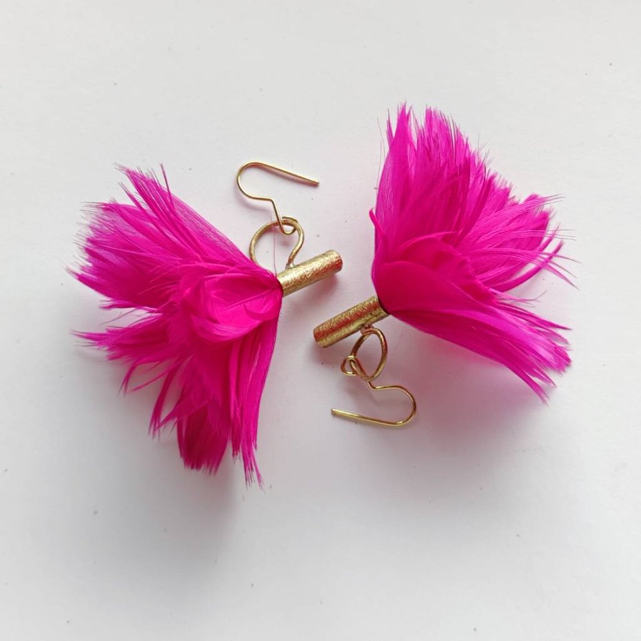 PIÓRKO – stylowy dodatek. Połączenie lekkości piórka i trwałości metalu. Metal niezwykle kontrastuje z naturalnym barwionym puchem. Kolczyki wykonane są z mosiądzu, naturalnie barwione pióra. Mosiądz – zmatowiony. Bigle otwarte – srebro pr.925,pozłacane. Długość z biglami ok. 6 cm. Szerokość – 6cm.