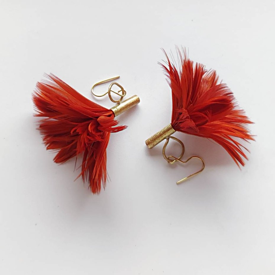 PIÓRKO – stylowy dodatek. Połączenie lekkości piórka i trwałości metalu. Metal niezwykle kontrastuje z naturalnym barwionym puchem. Kolczyki wykonane są z mosiądzu, naturalnie barwione pióra. Mosiądz – zmatowiony. Bigle otwarte – srebro pr.925,pozłacane. Długość z biglami ok. 6 cm. Szerokość – 6cm.
