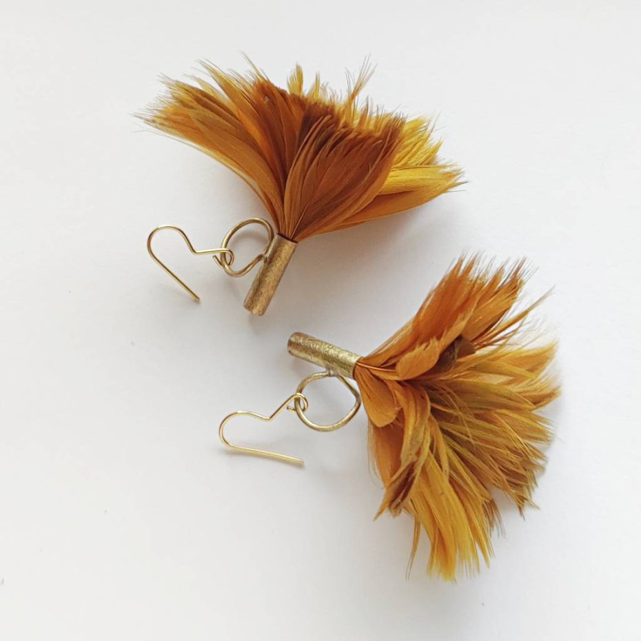 PIÓRKO – stylowy dodatek. Połączenie lekkości piórka i trwałości metalu. Metal niezwykle kontrastuje z naturalnym barwionym puchem. Kolczyki wykonane są z mosiądzu, naturalnie barwione pióra. Mosiądz – zmatowiony. Bigle otwarte – srebro pr.925,pozłacane. Długość z biglami ok. 6 cm. Szerokość – 6cm.