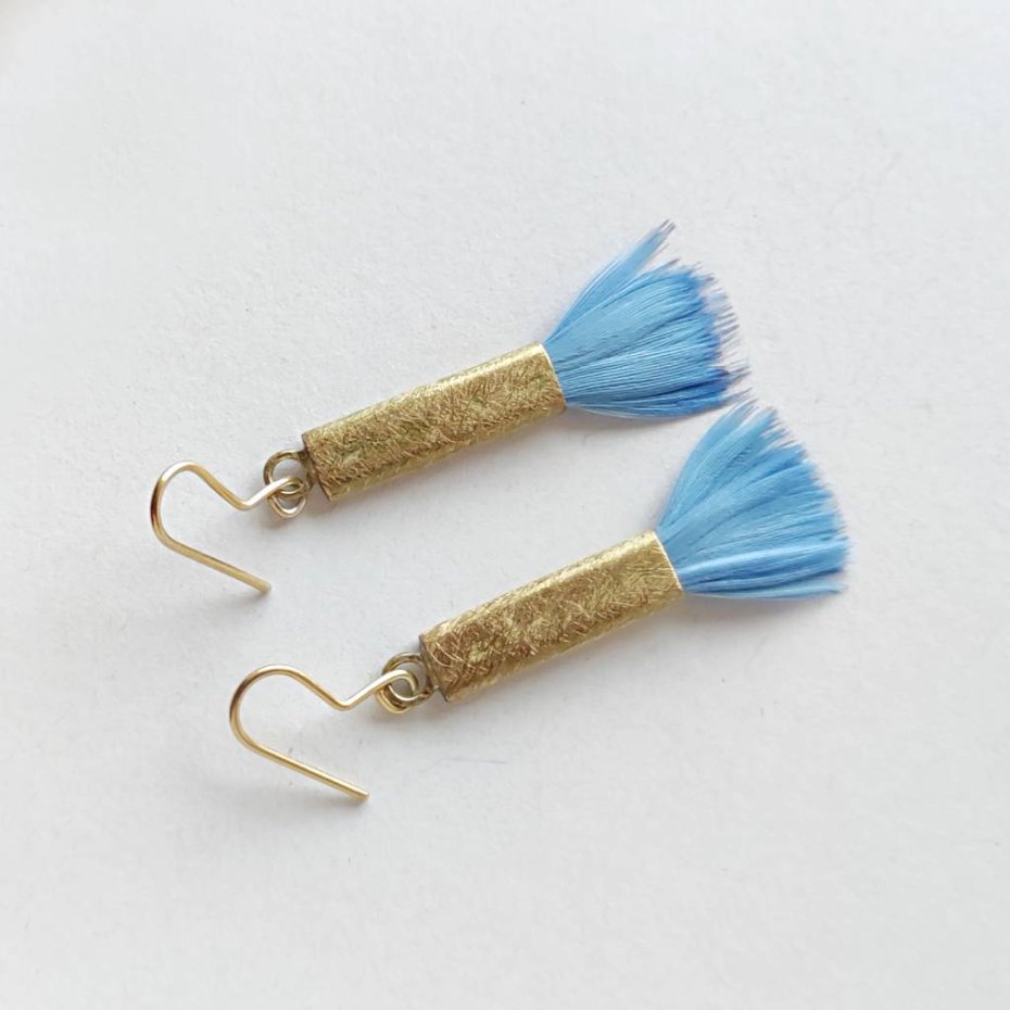 PIÓRKO - stylowy dodatek. Delikatne oraz lekkie kolczyki dodadzą charakteru każdej stylizacji. Metal niezwykle kontrastuje z naturalnym barwionym puchem. Kolczyki wykonane są z miedzi, naturalnie barwione pióra. Miedź - zmatowiony. Bigle otwarte - srebro pr.925. Długość z biglami - 5,5 cm. Szerokość - 1,5 cm. Waga - ok. 2,5 g.