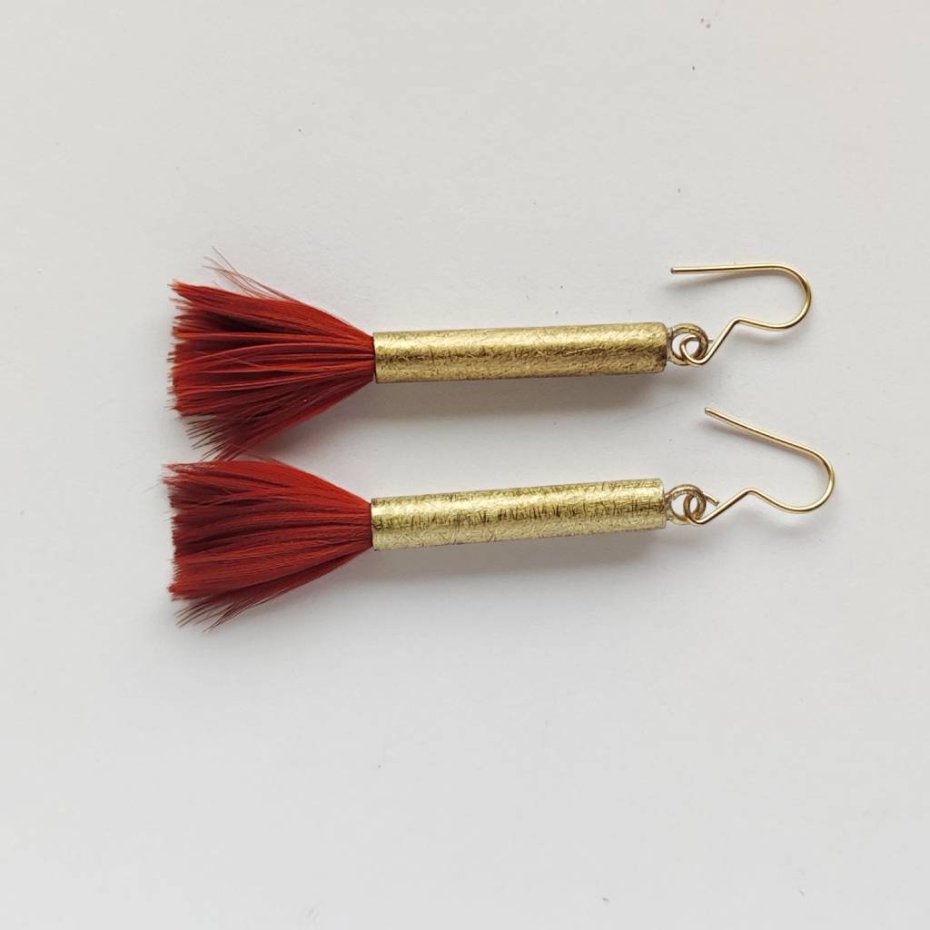 PIÓRKO - stylowy dodatek. Połączenie lekkości piórka i trwałości metalu. Metal niezwykle kontrastuje z naturalnym barwionym puchem. Kolczyki wykonane są z mosiądz, naturalnie barwione pióra. Mosiądz - zmatowiony. Bigle otwarte - srebro pr.925, pozłacane. Długość z biglami - 5 cm