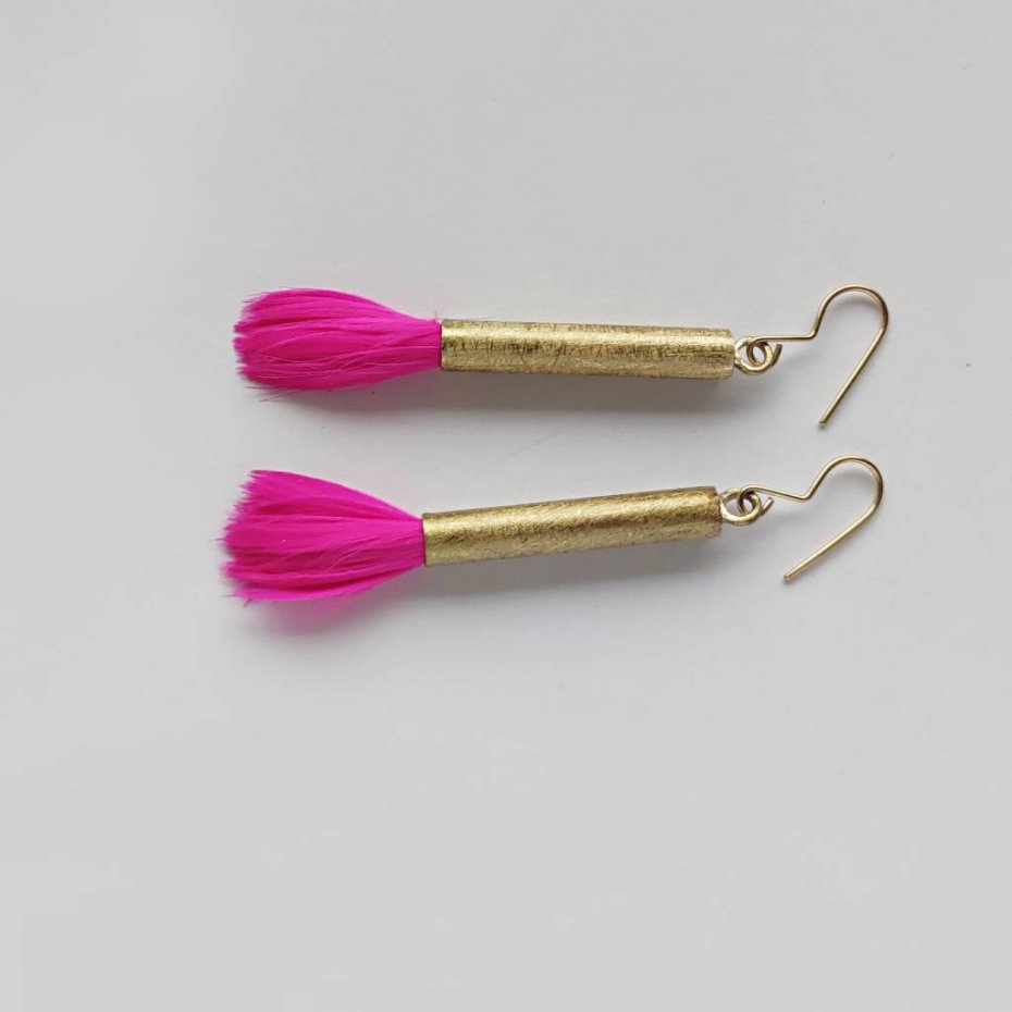 PIÓRKO - stylowy dodatek. Delikatne oraz lekkie kolczyki dodadzą charakteru każdej stylizacji. Metal niezwykle kontrastuje z naturalnym barwionym puchem. Kolczyki wykonane są z miedzi, naturalnie barwione pióra. Miedź - zmatowiony. Bigle otwarte - srebro pr.925. Długość z biglami - 5,5 cm. Szerokość - 1,5 cm. Waga - ok. 2,5 g.