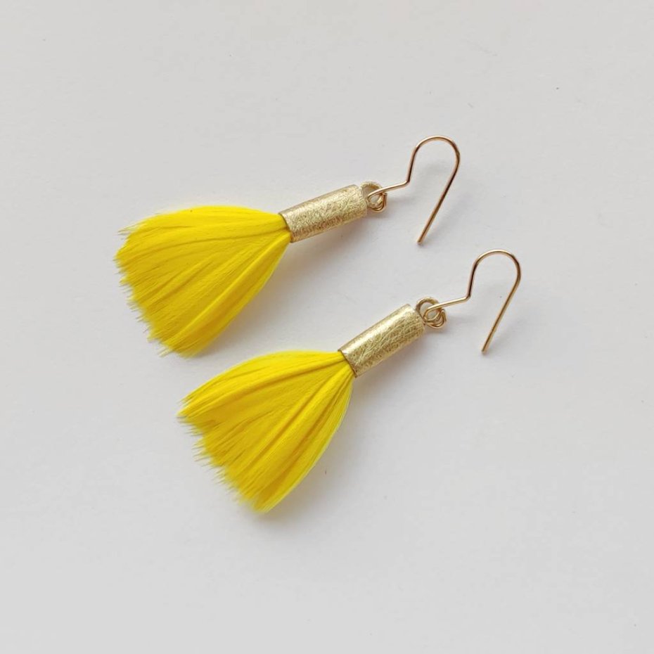 PIÓRKO - stylowy dodatek. Połączenie lekkości piórka i trwałości metalu. Metal niezwykle kontrastuje z naturalnym barwionym puchem. Kolczyki wykonane są z mosiądz, naturalnie barwione pióra. Mosiądz - zmatowiony. Bigle otwarte - srebro pr.925, pozłacane. Długość z biglami - 4,5 cm