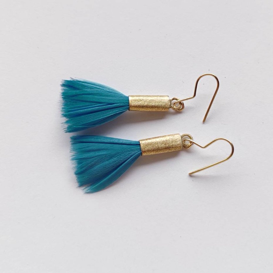 PIÓRKO - stylowy dodatek. Delikatne oraz lekkie kolczyki dodadzą charakteru każdej stylizacji. Metal niezwykle kontrastuje z naturalnym barwionym puchem. Kolczyki wykonane są z miedzi, naturalnie barwione pióra. Miedź - zmatowiony. Bigle otwarte - srebro pr.925. Długość z biglami - 4,5 cm. Szerokość - 1,5 cm. Waga - ok. 2,5 g.