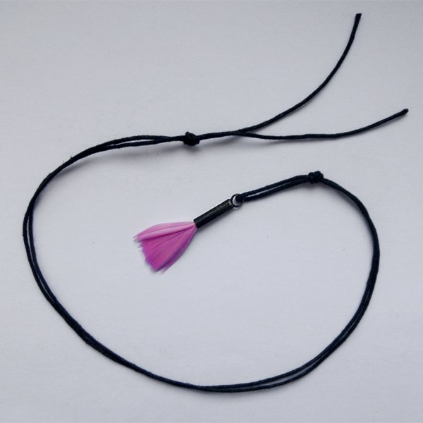PIÓRKO - stylowy dodatek. Połączenie lekkości piórka i trwałości metalu. Metal niezwykle kontrastuje z naturalnym barwionym puchem. Naszyjnik wykonana jest z : mosiądz, ozdobny sznurek, naturalne barwione pióra. Mosiądz : oksydowany. Długość sznurka: ok. 85 cm ( istnieje możliwość regulacji długości ). Długość zawieszki: ok. 4 cm. Szerokość: ok. 2 cm. Istnieje możliwość wykonania wisiorka w innych kolorach.