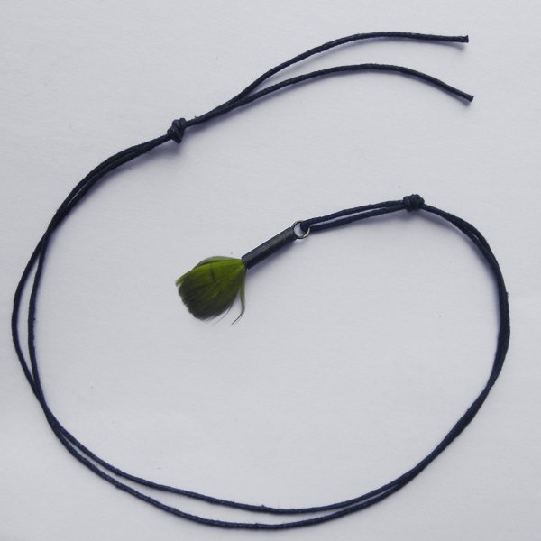 PIÓRKO - stylowy dodatek. Połączenie lekkości piórka i trwałości metalu. Metal niezwykle kontrastuje z naturalnym barwionym puchem. Naszyjnik wykonana jest z : mosiądz, ozdobny sznurek, naturalne barwione pióra. Mosiądz : oksydowany. Długość sznurka: ok. 85 cm ( istnieje możliwość regulacji długości ). Długość zawieszki: ok. 4 cm. Szerokość: ok. 2 cm. Istnieje możliwość wykonania wisiorka w innych kolorach.