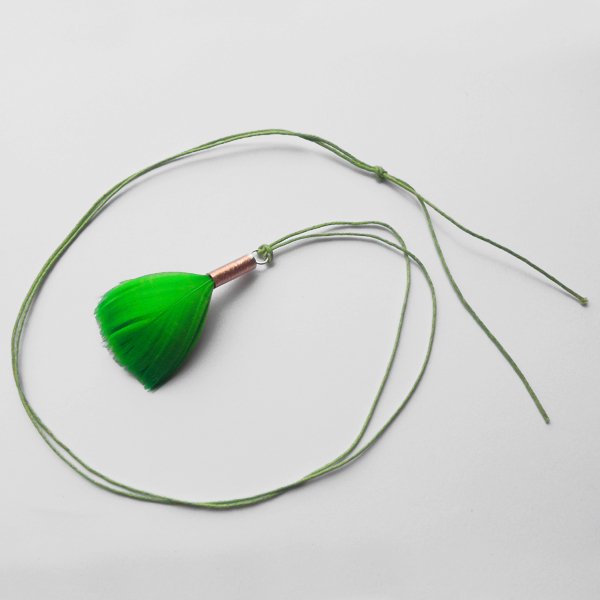 PIÓRKO - stylowy dodatek. Połączenie lekkości piórka i trwałości metalu. Metal niezwykle kontrastuje z naturalnym barwionym puchem. Naszyjnik wykonana jest z : miedź, ozdobny sznurek, naturalne barwione pióra. Miedź : zmatowiona. Długość sznurka: ok. 85 cm ( istnieje możliwość regulacji długości ). Długość zawieszki: ok. 6 cm. Szerokość: ok. 1,5 cm. Waga: ok. 2 g. Istnieje możliwość wykonania wisiorka w innych kolorach.