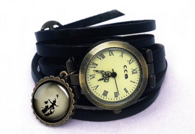 Zegarek ze skórzanym paskiem kilkakrotnie zakręcanym na ręku z ręcznie robioną zawieszką (kaboszonem).
