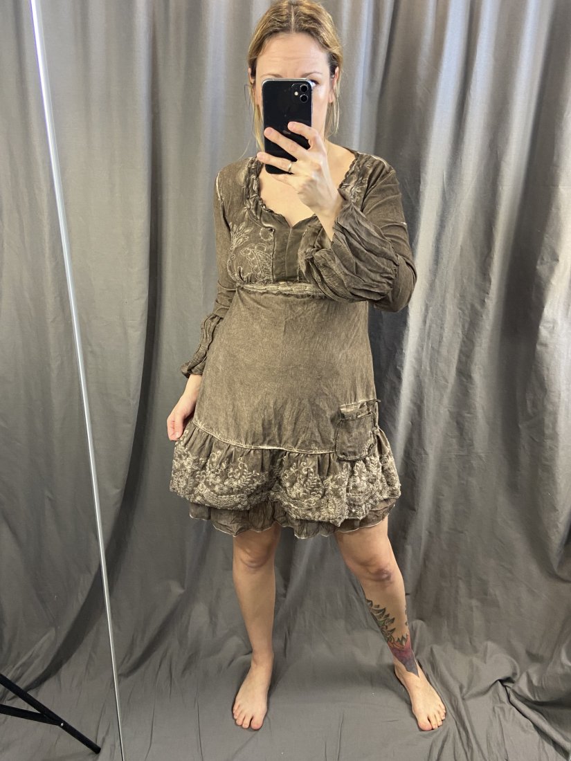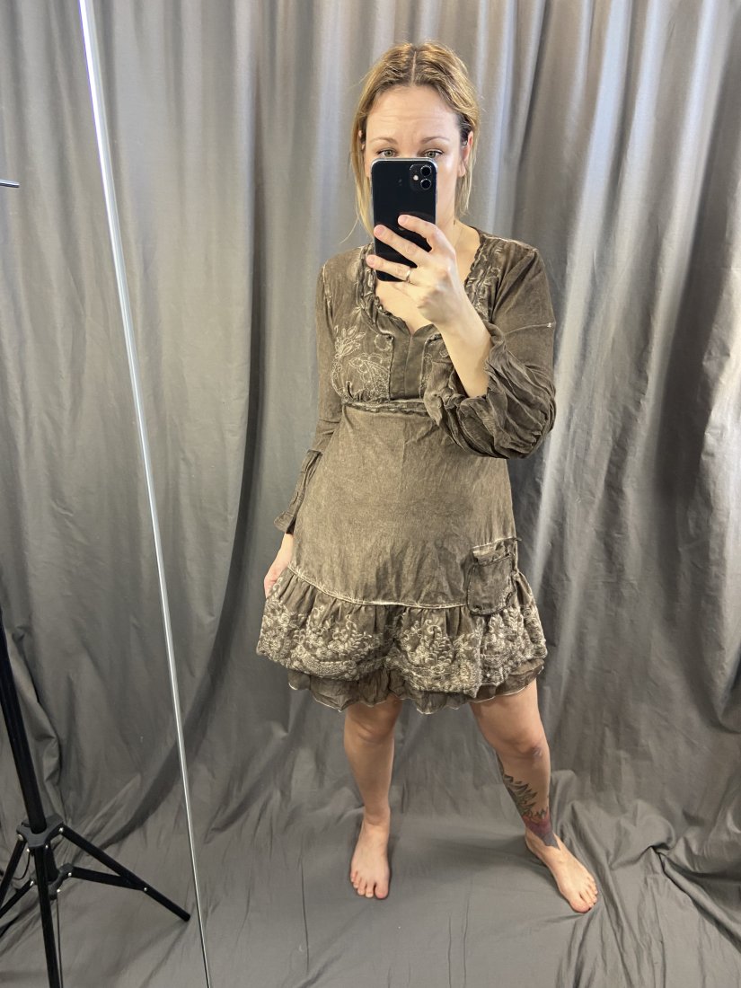 Przepiękna sukienka od Piro by Klaus Berggreen. Elastyczna bawełna. Dekolt i dół haftowany, w talii ozdobny panel.