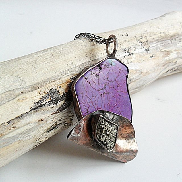 Wisior autorski z dużym plastrem howlitu i bryłką pirytu na miedzianej,cynowanej i patynowanej blaszce.Wymiary 6 na 4cm,łańcuszek w komplecie.