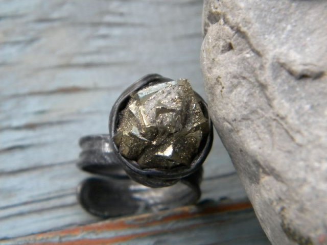 piescionek.miedz,cyna,piryt. (Kamień pochodzi z Chin) obraczka o szerokosci ok 5mm.wymiary oczka ok 1,6cm x 1.6cm. rozmiar regulowany,jednak lepiej żeby był ustawiony przeze mnie... Nabywce prosze o podanie rozmiaru - tak jak jest ustawiony na zdjeciach to rozmiar ok 16-17