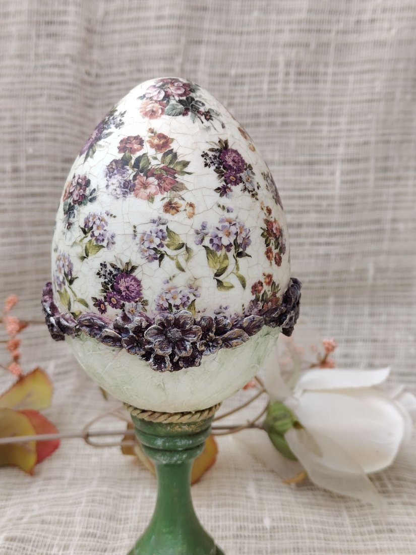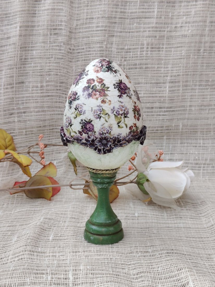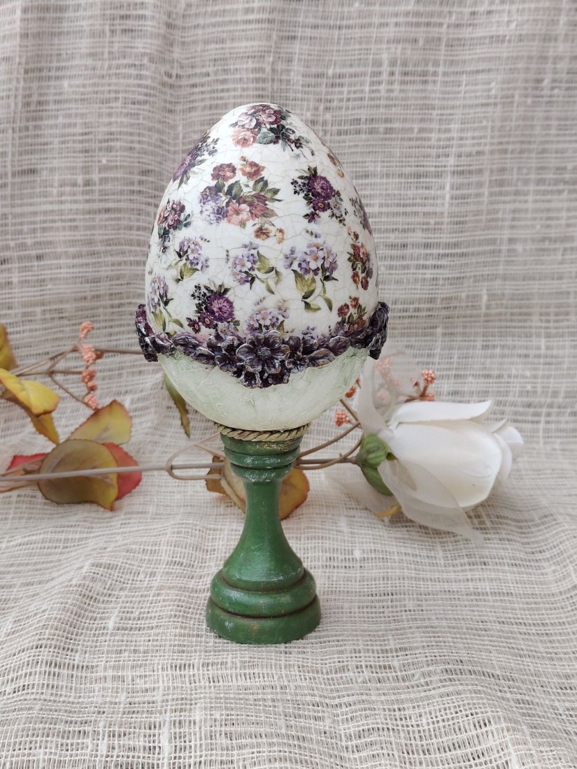 Pisanka osadzona jest na stabilnej, drewnianej podstawie w odcieniu klasycznej zieleni, co podkreśla jej naturalny i rustykalny styl. Idealnie sprawdzi się jako wielkanocna dekoracja stołu, komody czy witryny, ale również jako całoroczny element wystroju wnętrz w stylu shabby chic, prowansalskim lub klasycznym.