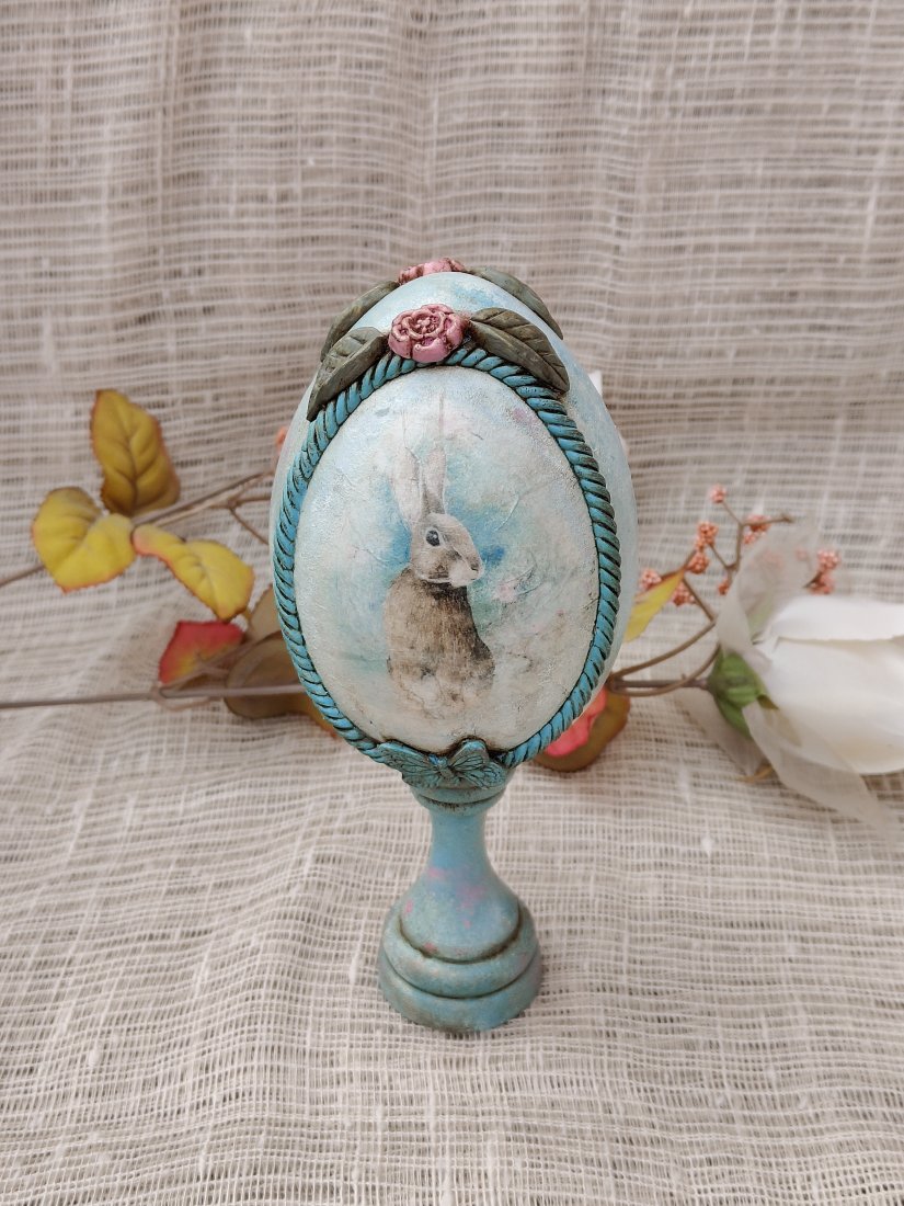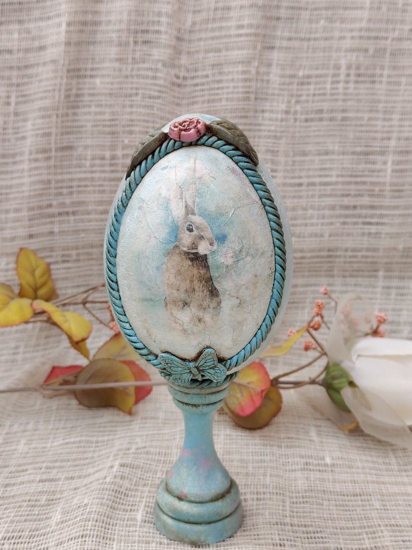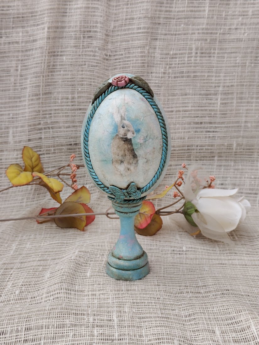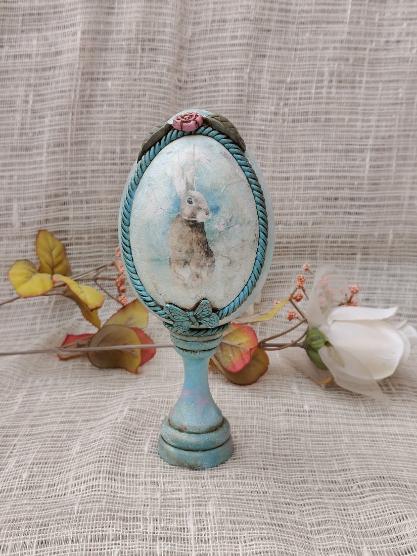 Elegancka pisanka dekoracyjna osadzona na stylowym postumencie to wyjątkowa ozdoba wielkanocna inspirowana klimatem retro. Centralne miejsce zajmuje subtelna grafika zajączka w delikatnych, pastelowych tonacjach, otoczona dekoracyjną ramą w turkusowym odcieniu z efektem przecierania. Całość dopełniają finezyjne detale – ozdobny sznur, mała różyczka u zwieńczenia oraz motyw motyla u podstawy jajka.