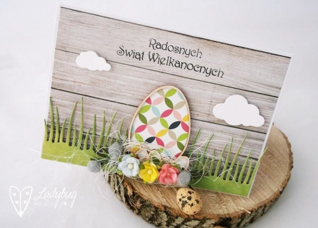 Na surowym tle z desek, w wysokiej trawie - kolorowa pisanka, wokół której urosły wiosenne kwiatuszki. Kartka prosta w formie, jednocześnie charakterna poprzez kolor i wzór. W środku ozdobne miejsce na życzenia.