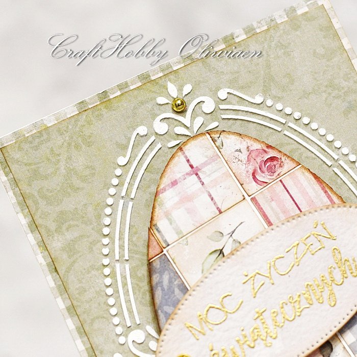 Kartka wykonana z bezkwasowych papierów do scrapbookingu, ozdobiona ramką z pasty strukturalnej, pisanką ze wzorem patchworka z wycinanych elementów, złotymi perełkami oraz stemplowanym i embossowanym na złoto napisem.
