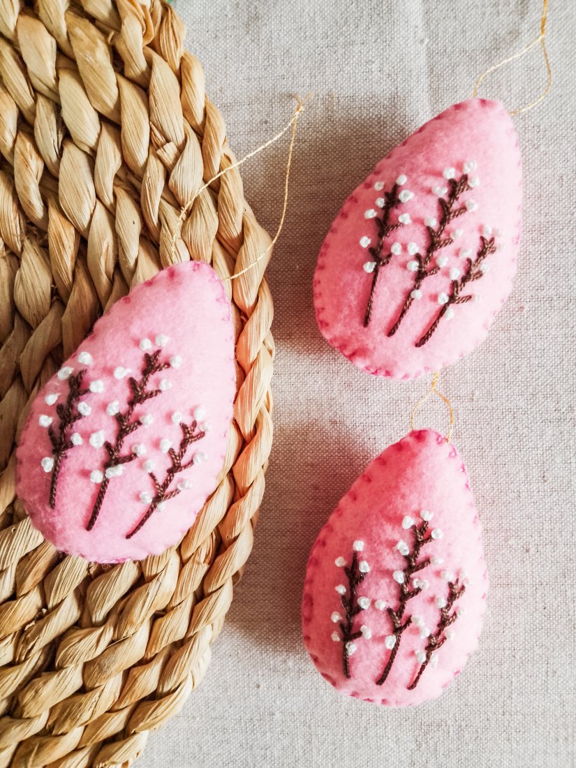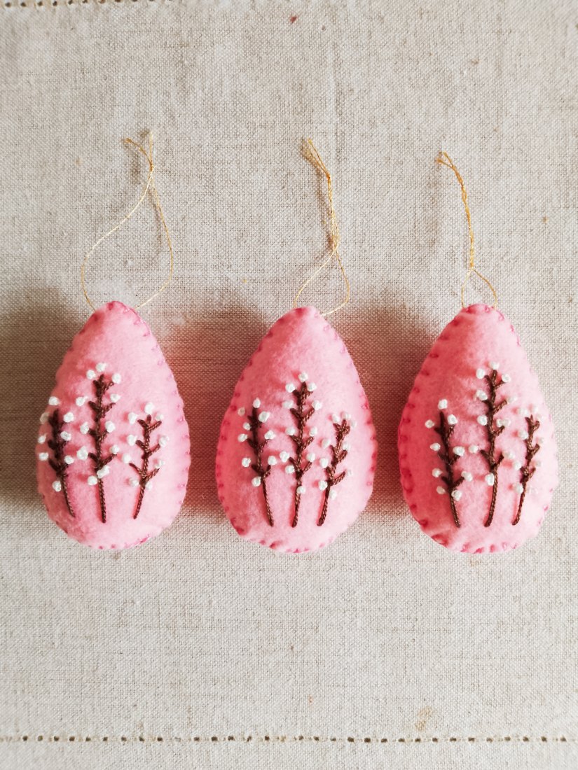 Komplet składający się z 3 sztuk zawieszek w kształcie pisanek. Kolor różowy z haftowanymi baziami. Zawieszka w kolorze złotym. Lekkie, miękkie, filcowe