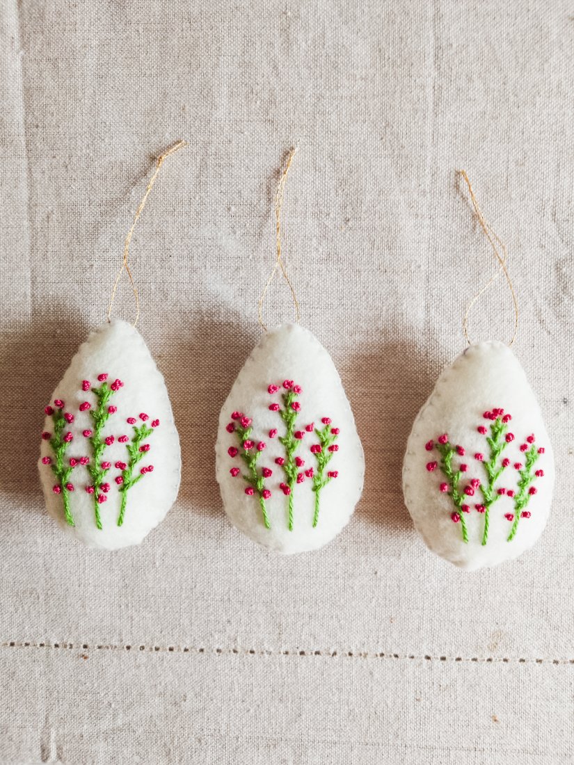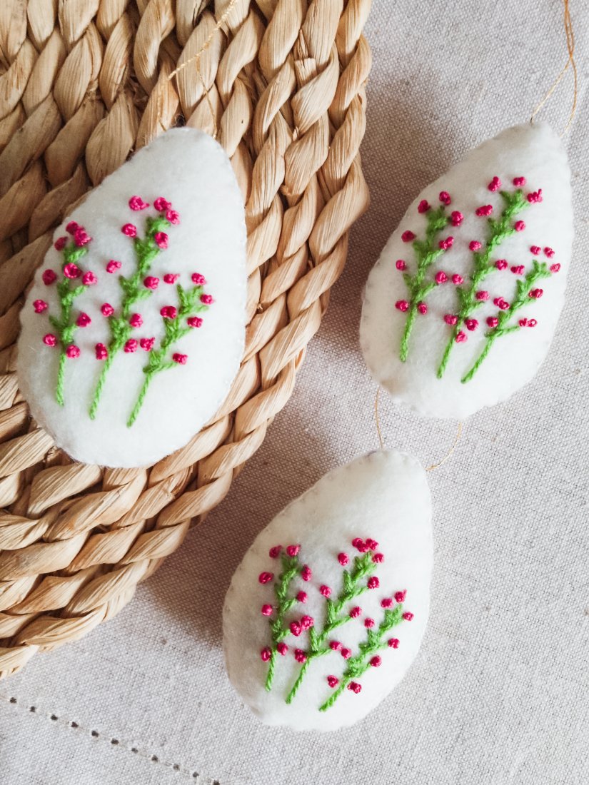 Komplet składający się z trzech pisanek, czyli filcowych zawieszek z ręcznie haftowanymi kwiatuszkami.