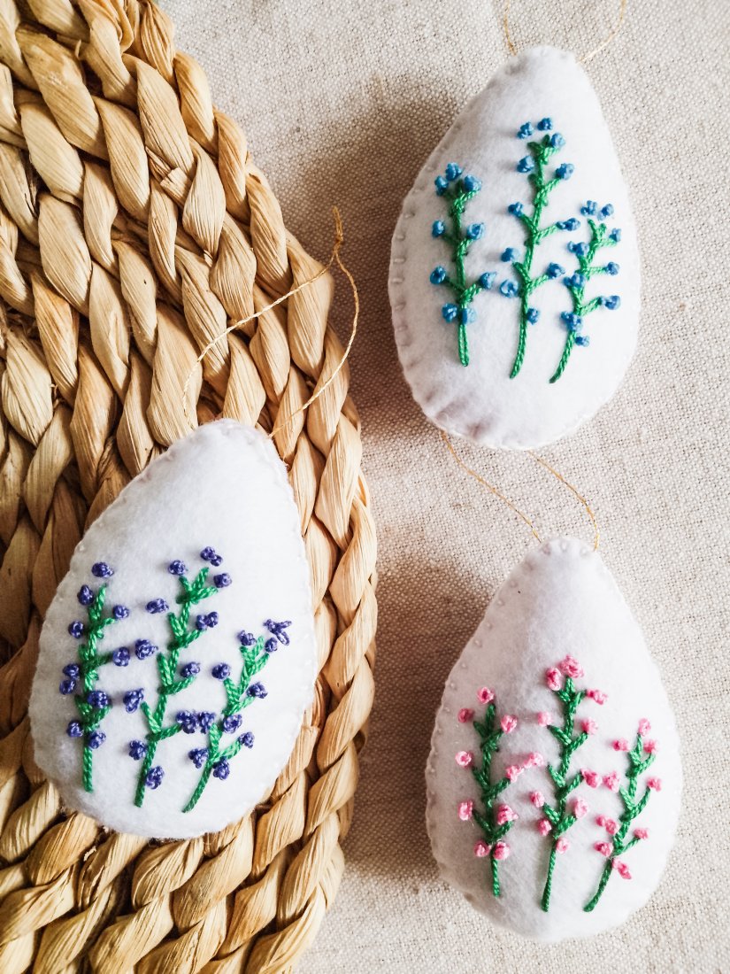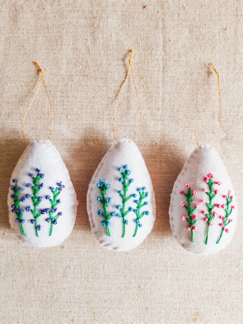 Komplet składający się z trzech pisanek, czyli filcowych zawieszek z ręcznie haftowanymi kwiatuszkami.