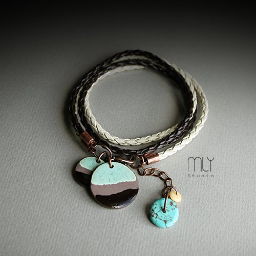 Efektowna bransoletka wykonana z rzemienia jubilerskiego w kolorze brązowym i ecru, elementów w kolorze miedzianym i ręcznie wykonanych ceramicznych zawieszek, szkliwionych mieszanką brązowych i zielonych szkliw z efektem plamek o subtelnym połysku, Obwód regulowany. Polecam