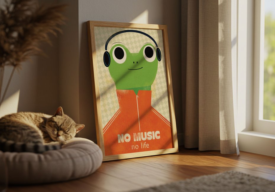 Wprowadź do wnętrza odrobinę humoru i stylu z plakatem "NO MUSIC no life". Przedstawia zieloną żabę w czarnych słuchawkach i pomarańczowym dresie – postać pełną luzu i muzycznej pasji. Ilustracja utrzymana jest w lekkim, graficznym stylu z subtelnym tłem. Fajnie sprawdzi się w pokoju nastolatka oraz fana muzyki.