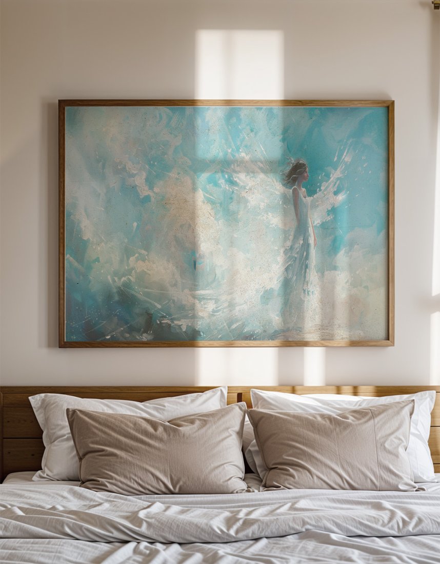 Uroczy plakat przedstawiający anioła w postaci kobiety w chmurach to wyjątkowy dodatek do Twojej przestrzeni. Delikatne odcienie błękitu z turkusem i bieli nadają mu spokojny, wręcz boski charakter. Ten obraz emanuje harmonią i pokojem, idealnie nadając się do każdego pomieszczenia, które chcesz wypełnić spokojem i pięknem.