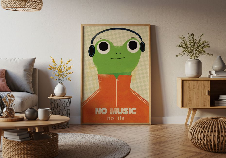 Wprowadź do wnętrza odrobinę humoru i stylu z plakatem "NO MUSIC no life". Przedstawia zieloną żabę w czarnych słuchawkach i pomarańczowym dresie – postać pełną luzu i muzycznej pasji. Ilustracja utrzymana jest w lekkim, graficznym stylu z subtelnym tłem. Fajnie sprawdzi się w pokoju nastolatka oraz fana muzyki.