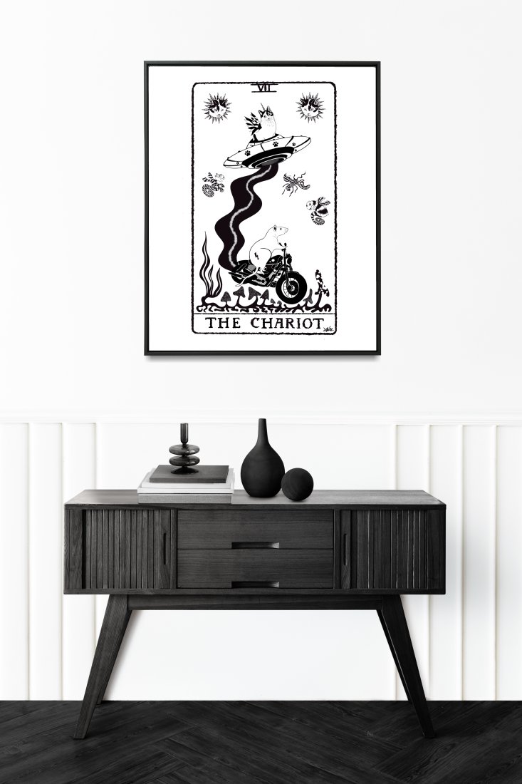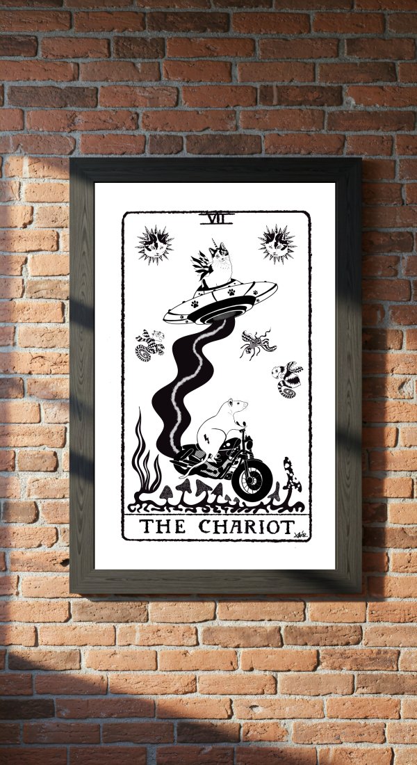 W Cosmic Republic Rydwan nie jest ciągnięty przez konie. Jest napędzany wysokooktanową benzyną i czystą wolą przetrwania. Oto VII: THE CHARIOT. Nasz bohater – Szczur Speedy (symbol buntu i szybkości) – pędzi na swoim chopperze przez psychodeliczną krainę grzybów. Czy ucieka przed UFO pilotowanym przez K-Kota? A może to kosmiczna eskortą do innego wymiaru? To karta zwycięstwa, determinacji i jazdy "ile fabryka dała". Zamiast lejców mamy kierownicę, zamiast zbroi – futro i prędkość. Dwa kocie słońca patrzą z góry na ten surrealistyczny pościg. To idealny plakat dla każdego, kto jest w ciągłym ruchu, kocha motoryzację, sci-fi albo po prostu ucieka przed szarą rzeczywistością.