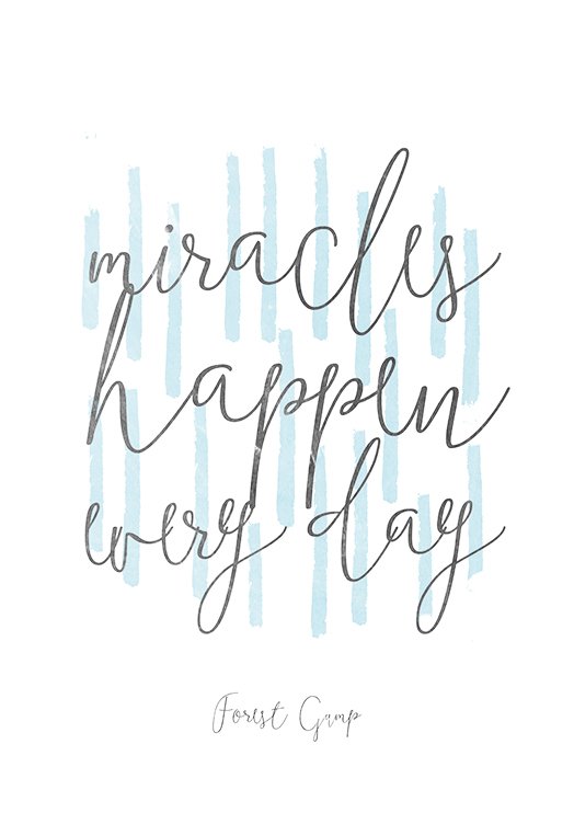 Plakat typograficzny z pięknym cytatem z filmu Forrest Gump "miracles happen every day" ("cuda zdarzają się każdego dnia.")