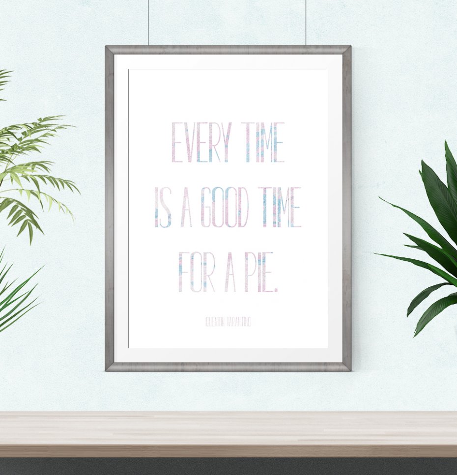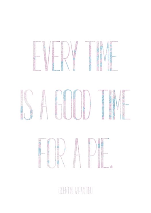 Plakat typograficzny z cytatem Quentina Tarantino "everytime is a good time for a pie" ("Każda godzina jest dobra na ciasto")