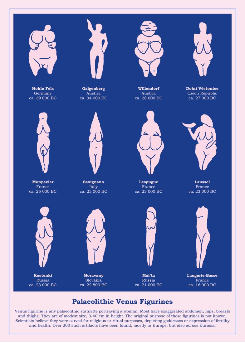 Cyfrowa ilustracja przedstawiająca paleolityczne figurki wenus.