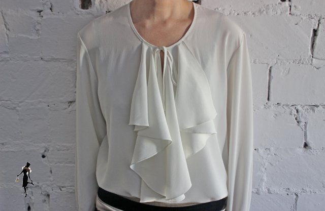 Bluzka ecure z żabotem. Firma Planet. Rozmiar 42/XL. Wymiary: obwód biustu-57cmx2, obwód bioder-57cmx2, długość rękawa-60cm, długość bluzki-67cm. Skład materiału: 100% poliester.