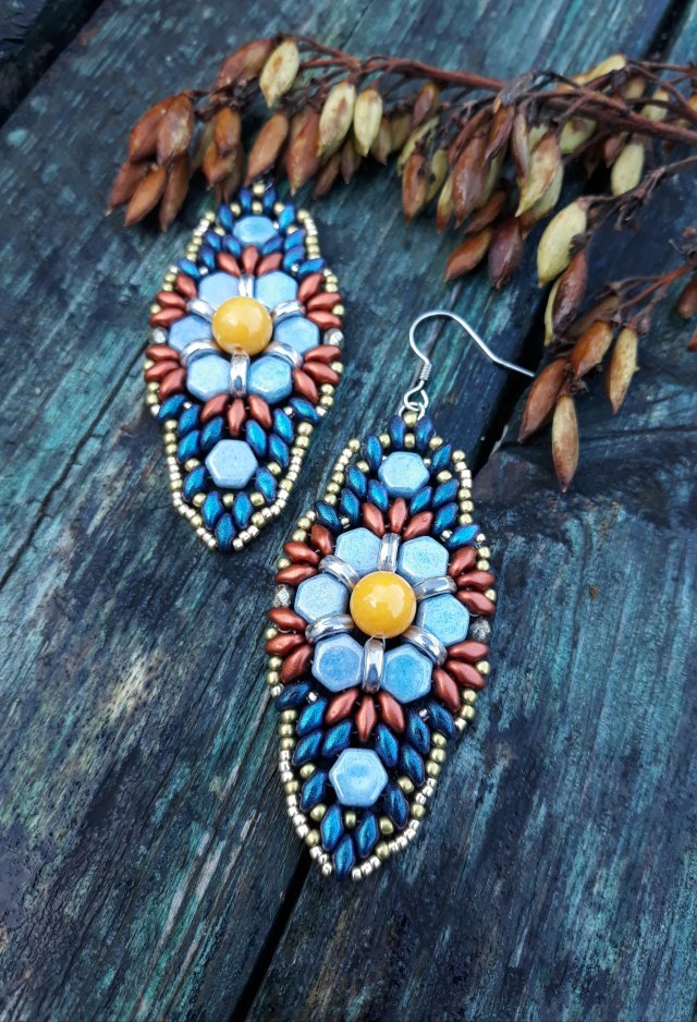 ,,plaster miodu,,to wiszące kolczyki utrzymane w kolorystyce złota, brązu i niebieskiego, wykonane ze szklanych koralików i kryształków, z dodatkiem żółtego jadeitu. Kolczyki zawieszone są na klasycznych biglach wykonanych ze stali szlachetnej.