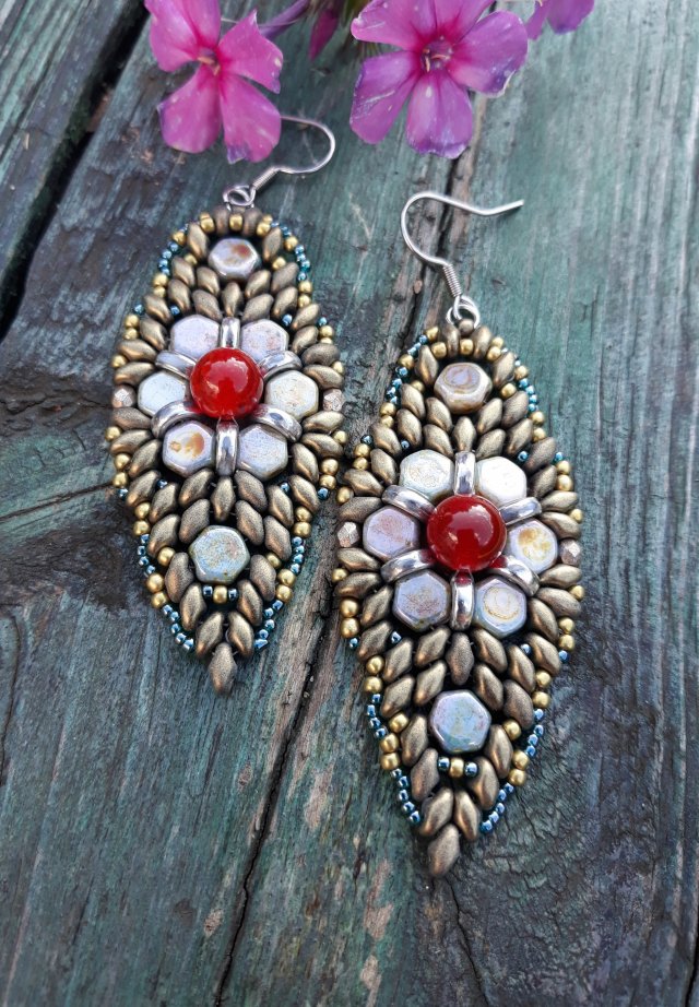 ,,plaster w starym złocie,, to wiszące ażurowe kolczyki wykonane ze szklanych koralików i kryształków w różnych odcieniach złota, zieleni, z dodatkiem pomarańczowego agatu. Kolczyki zawieszone są na ozdobnych klasycznych biglach wykonanych ze stali szlachetnej.