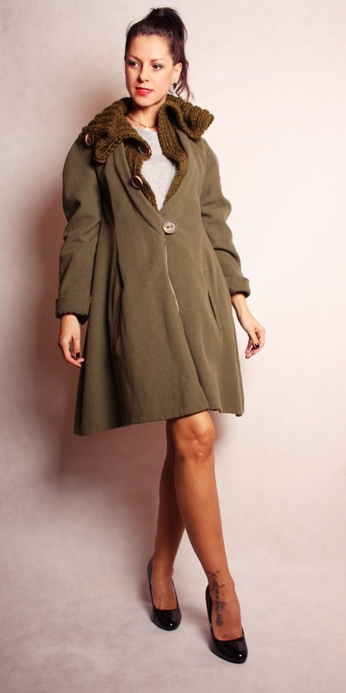 wełniany plaszczyk na podszewce,w kolorze zgniłej zieleni,osoba na zdj.nosi rozm.S/wzrost 170c