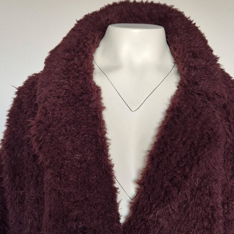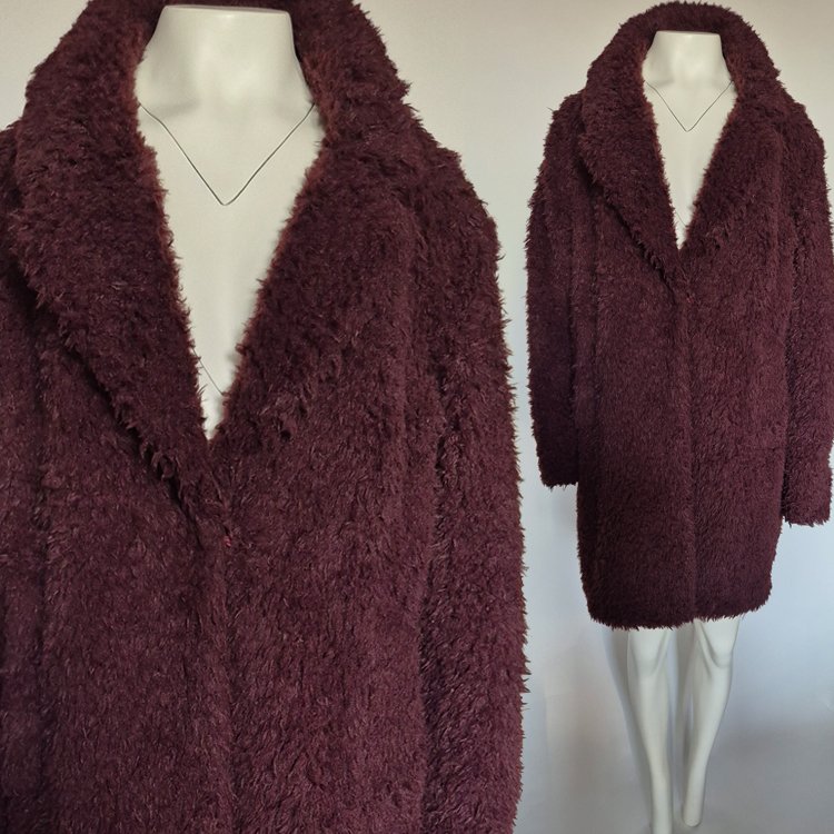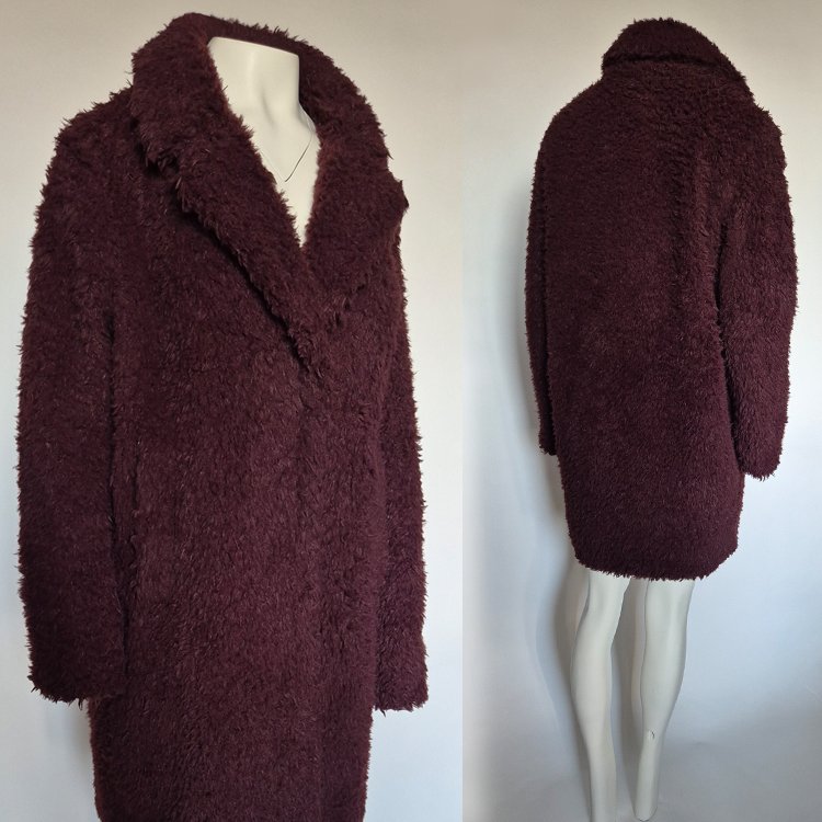 Efektowny ciepły płaszcz typu futerko / teddy w kolorze bordo / burgund. Model o luźnym, lekko oversize’owym kroju, długości przed kolano. Płaszcz z kołnierzem rewersowym, zapinany na haftki, wykończony podszewką, po bokach kieszenie wpuszczane. Idealny zarówno do stylizacji codziennych, jak i bardziej eleganckich – dobrze wygląda z jeansami, sukienką czy botkami.
