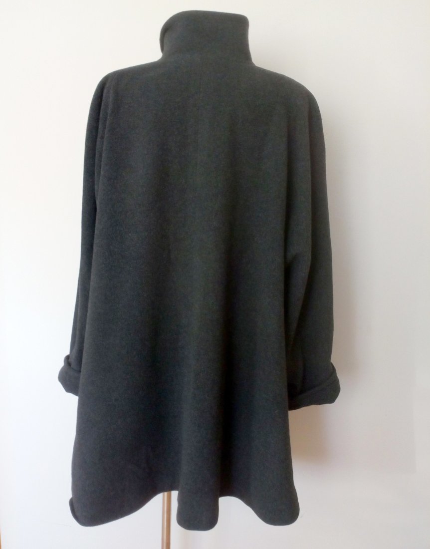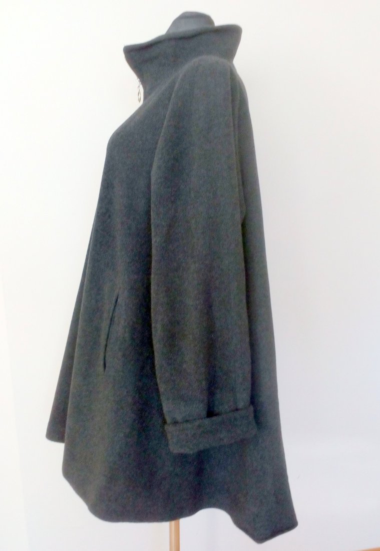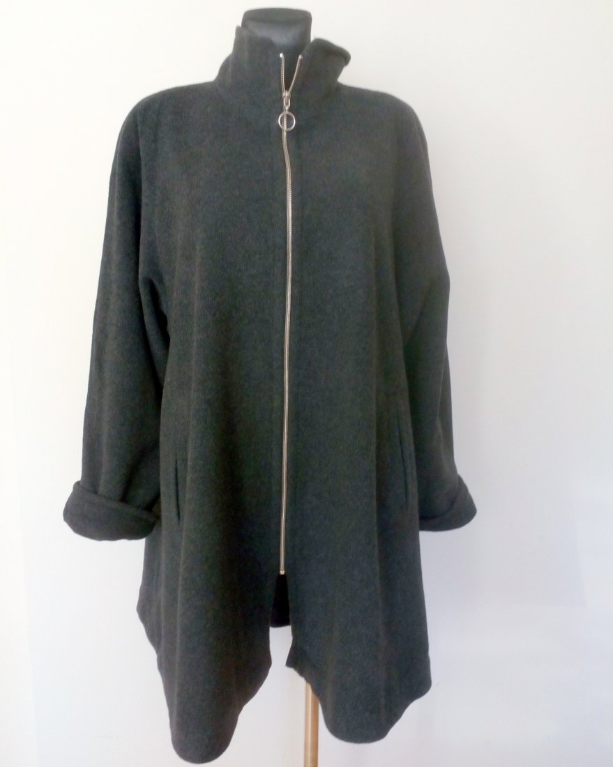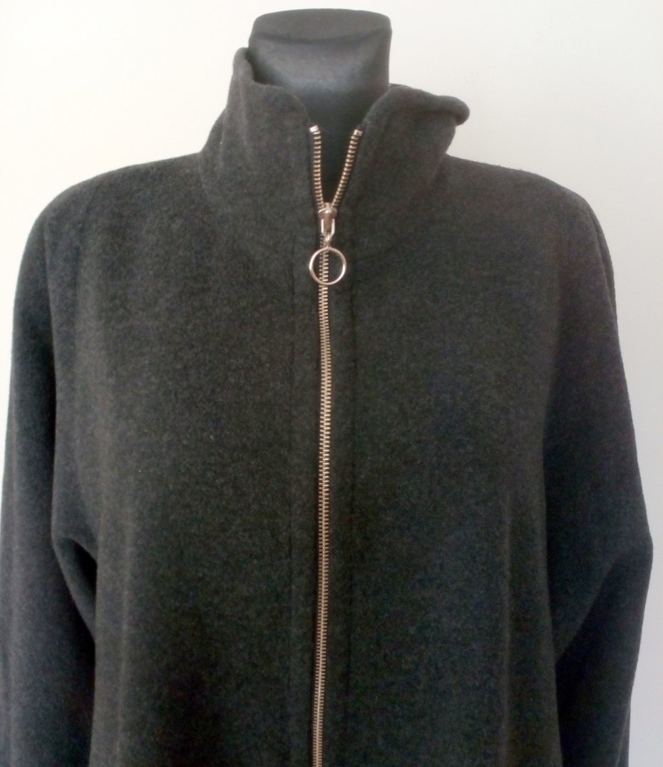 Wełniany płaszcz w ciemnym, grafitowym kolorze, fason rozszerzany do dołu, zapinany pod samą szyję na metalowy zamek w srebrnym kolorze, z przodu pionowo wpuszczane kieszenie, rękaw z odwijanym mankietem, na ramionach cienkie poduszki, od środka grafitowa podszewka