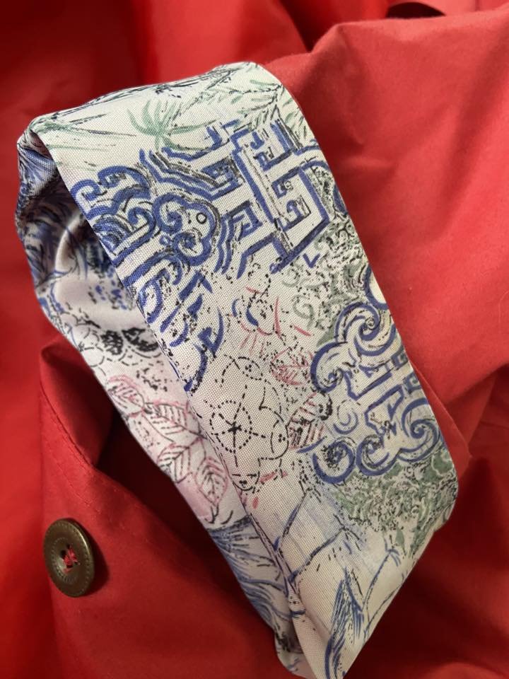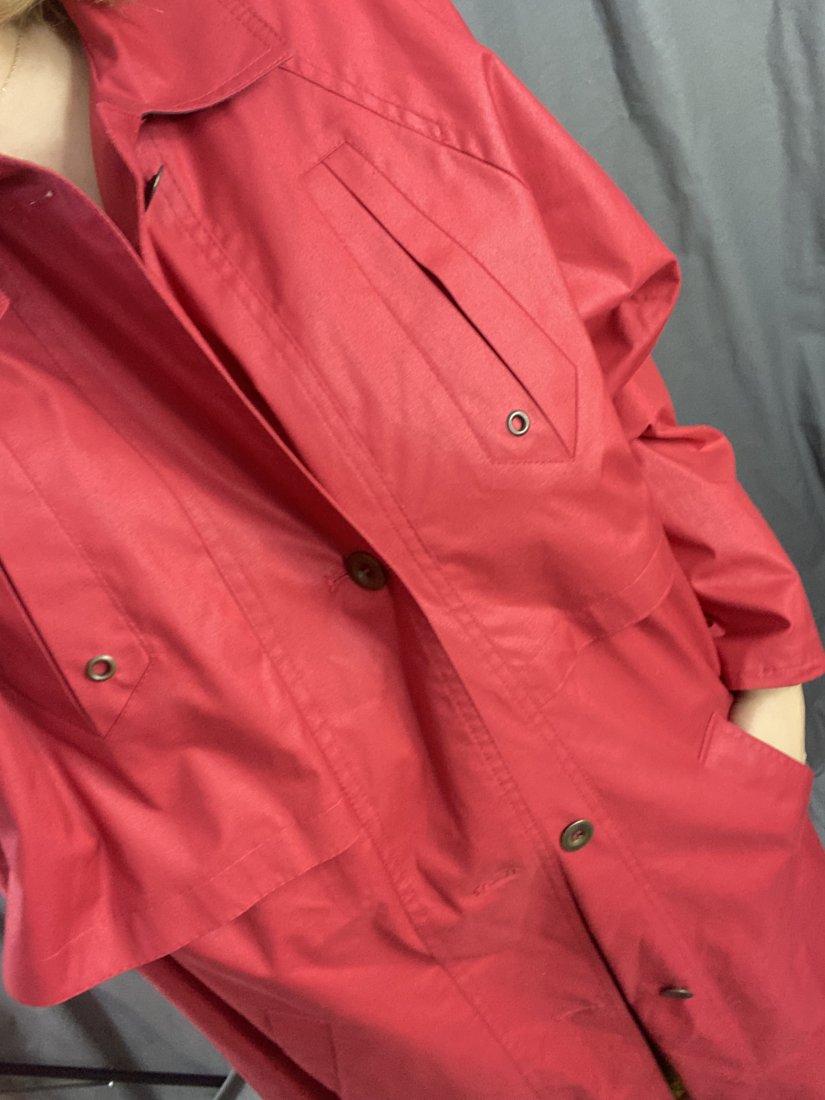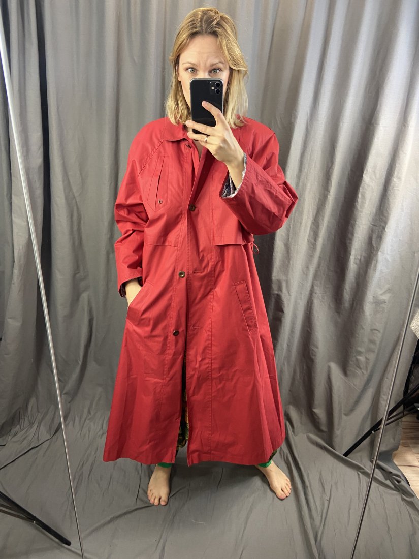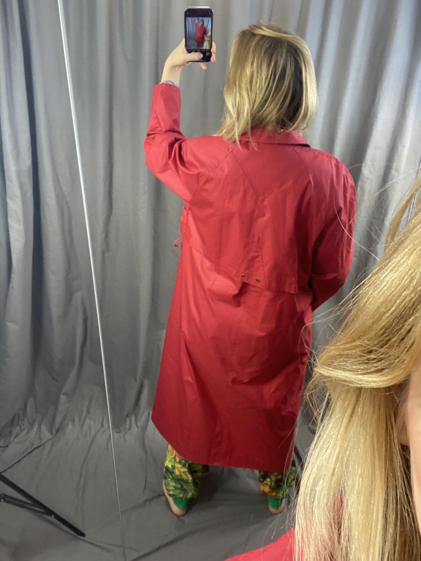 Płaszczyk uszyty w Polsce. Nie ma metek firmowych, jest metka ze składem 52% bawełna, 48% poliester. Zapinany na guziki. W ramionach delikatne poduchy. Świetny! Nie wywinęłam tutaj makietów na sesji, ale można wywijać (jest kolorowe podszycie) - zdjęcie w zbliżeniu.