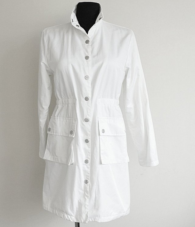 Cienki płaszcz marki New Look o sportowym kroju. Kolor biały, materiał 55% bawełna, 45% nylon, pod spodem bawełniana podszewka z nadrukiem. Stan bardzo dobry. Prawdopodobnie brak tasiemki w tunelu na dole. Rozmiar z metki 10. Podaję wymiary mierzone na płasko;