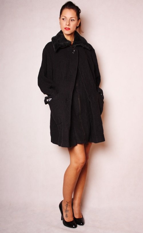 Czarny płaszczyk z futrzanym kolnierzem, ktory jest odpinany,na podszewce,długośc przed kolano przy 170cm wzrostu,rozm M, osoba na zdj.nosi rozm.S