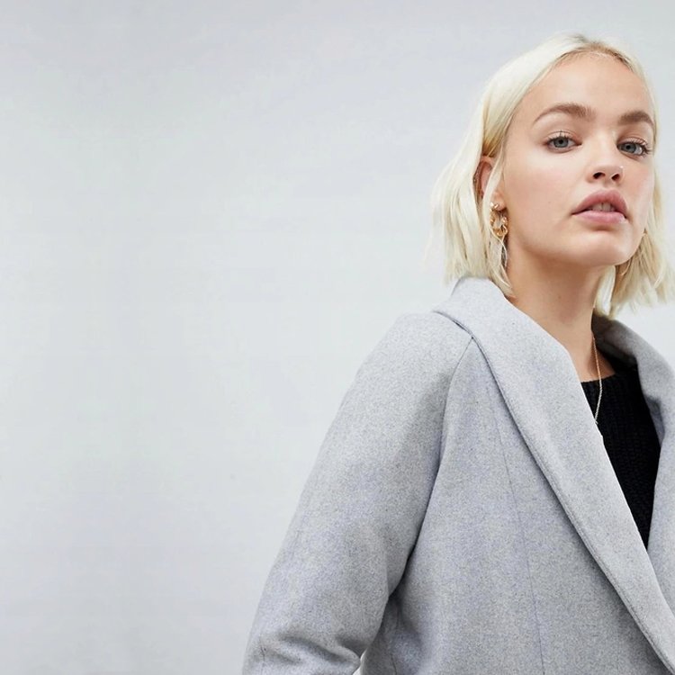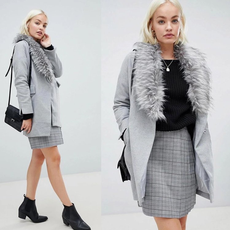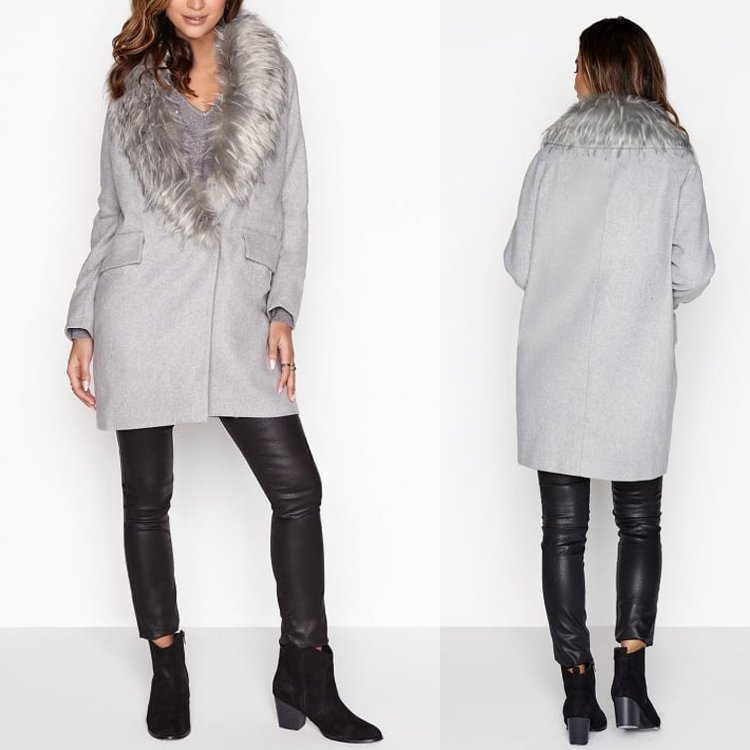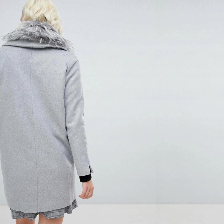 Szary płaszcz o linii dopasowanego kokonu, z kołnierzem szalowym, wykończonym sztucznym futrem (odpinane). Rękawy raglanowe, w pasie kieszenie z klapami. Płaszcz na podszewce, z przodu zapinany na kryte zatrzaski. Idealny na sezon przejściowy.