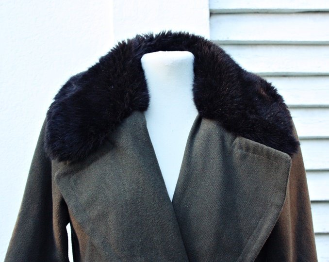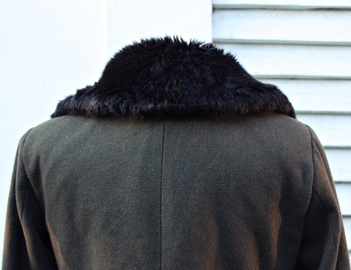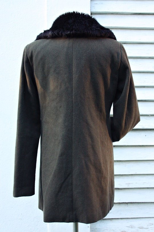 Ciemnozielony płaszcz marki Atmosphere z dodatkiem wełny.Czarny ,futrzany kołnierz /nieodpinany/.kieszenie zapinane na zamek,stan bardzo dobry,rozm 38