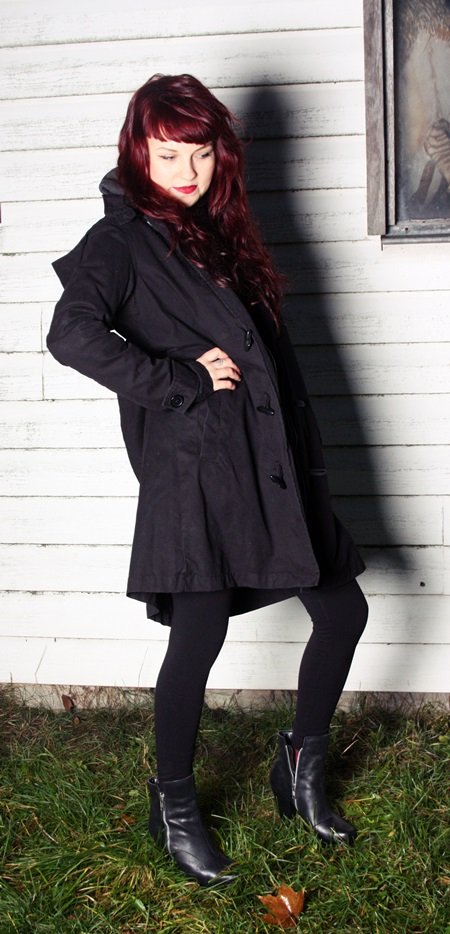 Czarny plaszczyk z kapturem,na podszewce bialo czarne paski,stan bardzo dobry,rozm.S/M.kaptur odpinany,na plecach kontrafałda, material 100% BAWEŁNA,osoba na zdj. nosi rozm.S/wzrost 158cm.