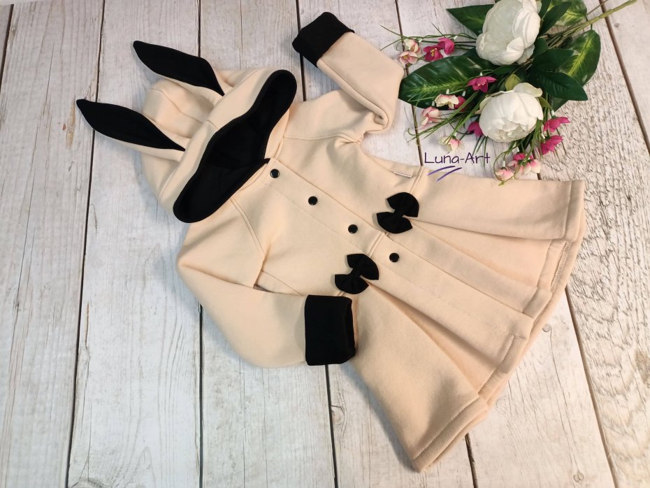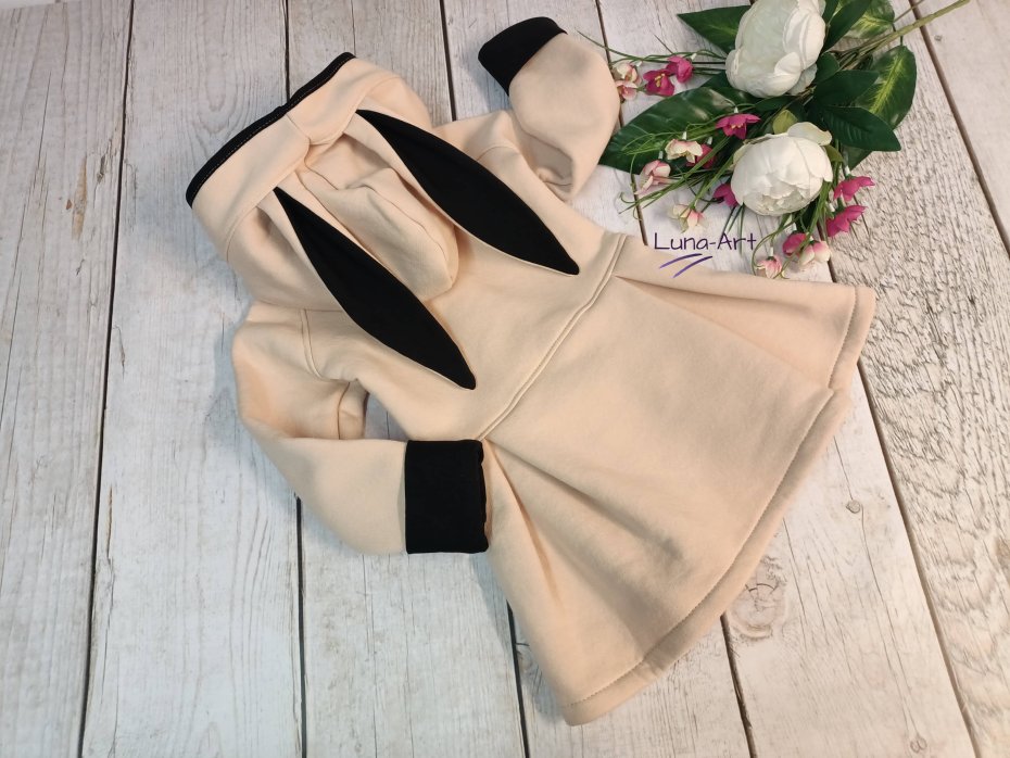 Płaszczyk uszyty z dresówki drapanej, z kapturem i uszami w kolorze beżowo- różowym.