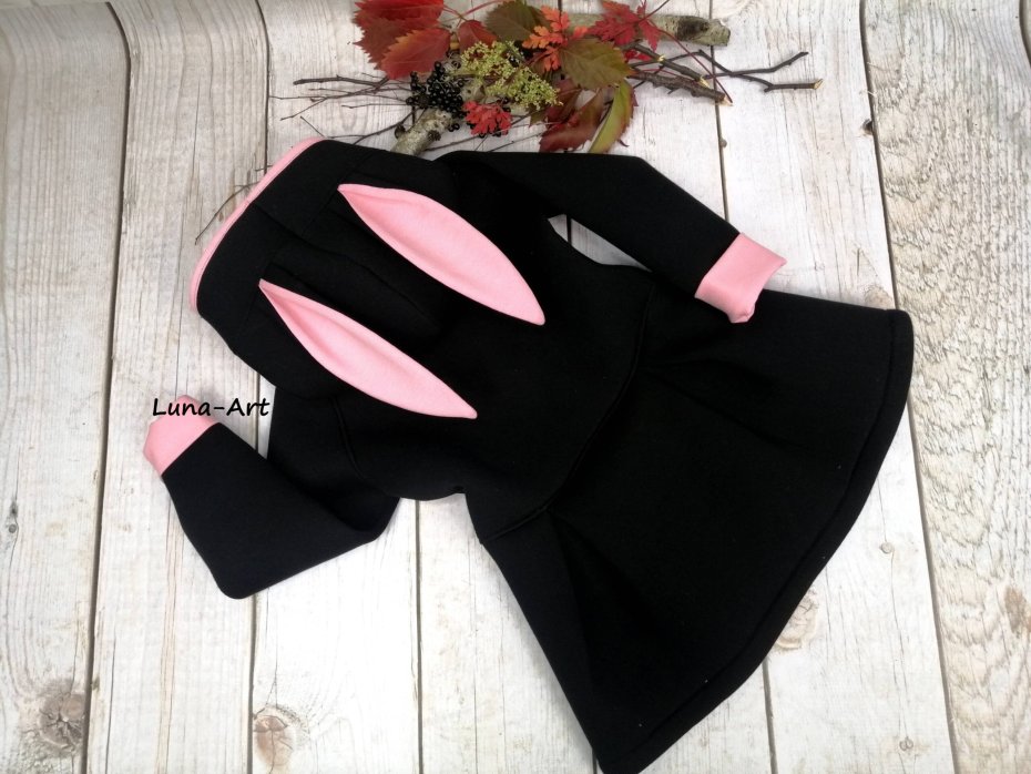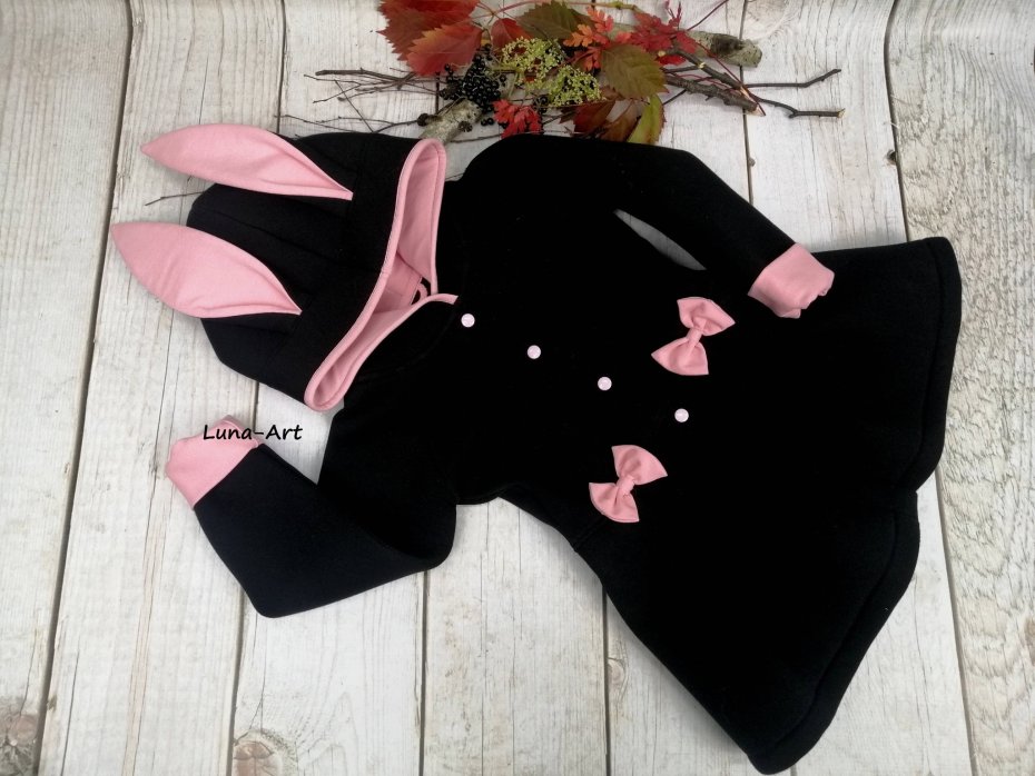 Płaszczyk uszyty z czarnej pianki, z kapturem i uszami.