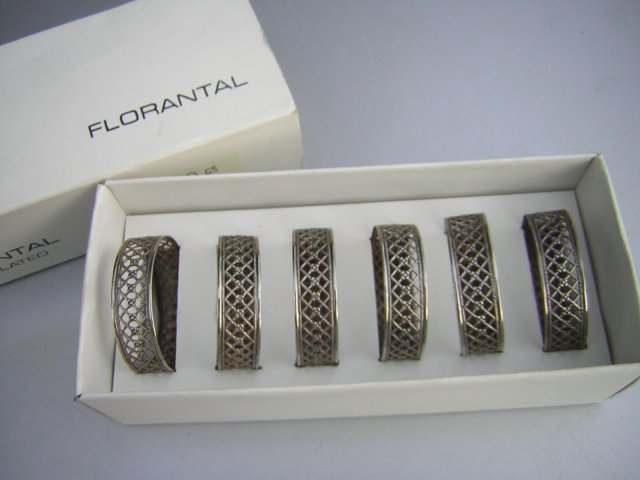 Zestaw sześciu platerowanych / srebrzonych/ subtelnie azurowych serwetników w oryginalnym opakowaniu.Nowe, nie używane. Eleganckie, delikatnie zdobione, subtelnie ażurowe z podkreślonym rantem. . Nie sygnowane, szlachetnie wykonane. Oryginalnie zapakowane w tekturowe pudełko z napisem - FLORANTAL SILVER PLATED MADE IN ENGLAND.