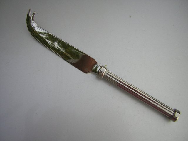 Platerowany / srebrzony / nóż do serów. Elegancka prostota, wygodna ryflowana rączka, forma typowa do serów eleganckiego na stół podania.Nie sygnowany.