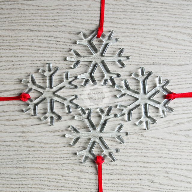 Zestaw czterech świątecznych zawieszek na choinkę, w kształcie płatków śniegu. Elementy wykonane ze szkła metodą fusingu ze szkła bezbarwnego. Delikatne, pięknie odbijające światło.