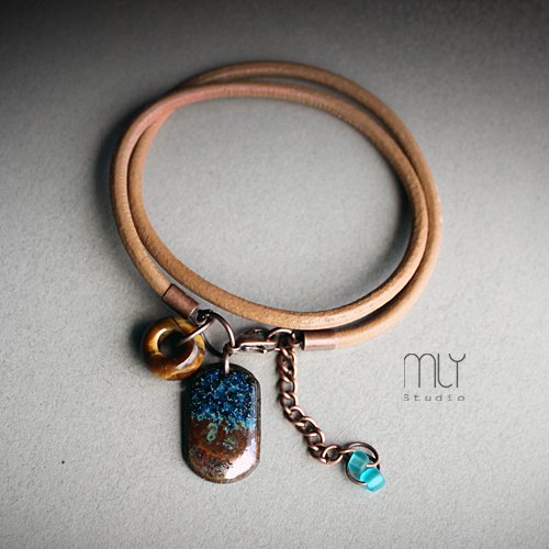 Efektowna bransoletka wykonana ze ekologicznego rzemienia jubilerskiego w kolorze brązowym, elementów w kolorze starego złota i ręcznie wykonanego ceramicznego elementu szkliwionego mieszanką zielonych i złotych szkliw z efektem plamek. Obwód regulowany. Polecam